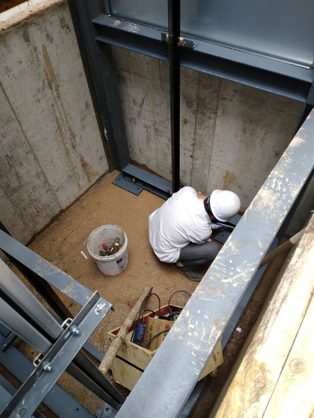 第二大部件——轿厢,稳稳放入支架中,像雏鸡偎入妈妈的怀抱